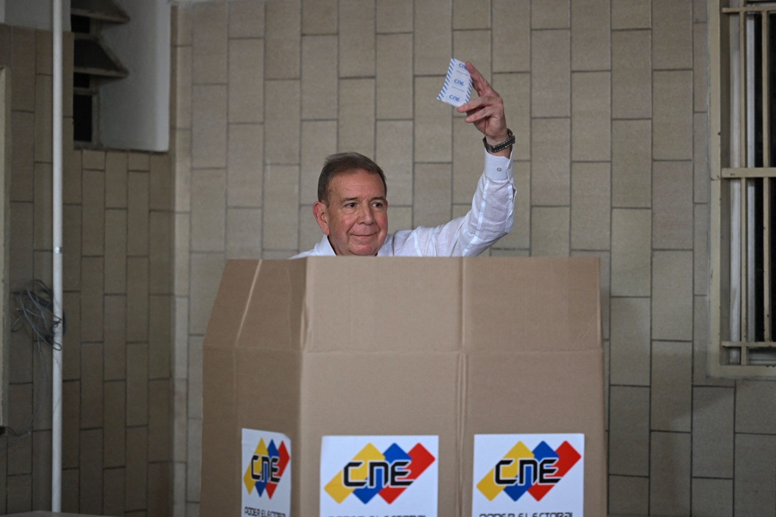 O candidato presidencial da oposição venezuelana Edmundo Gonzalez Urrutia mostra sua cédula enquanto vota na escola Santo Tomas de Villanueva em Caracas durante a eleição presidencial em 28 de julho de 2024. — Foto: Photo by RAUL ARBOLEDA / AFP
