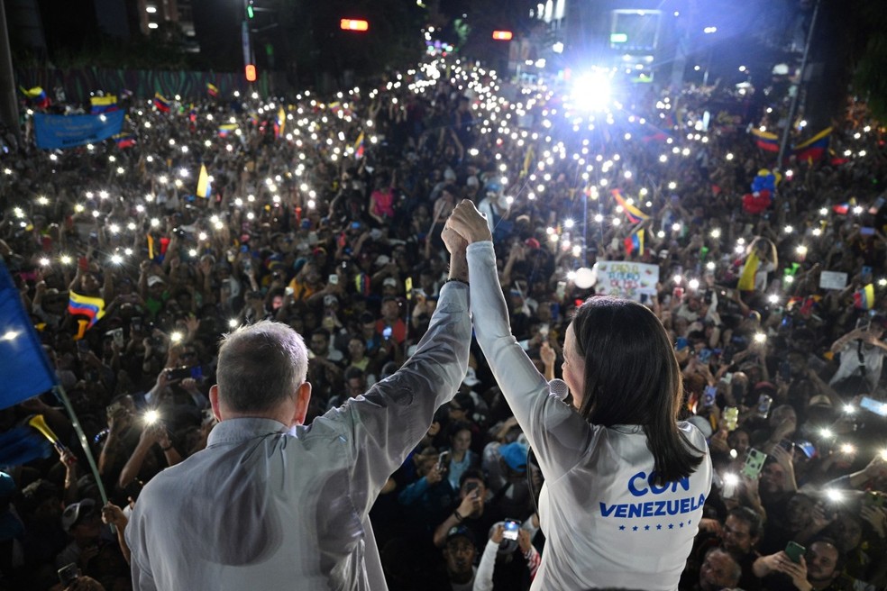 O candidato presidencial da oposição venezuelana Edmundo González Urrutia (E) e a líder da oposição María Corina Machado acenam aos apoiadores durante comício de encerramento de campanha em Caracas — Foto: Federico PARRA / AFP