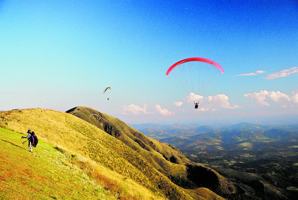 Na Serra da Moeda,com 1.500 metros de altitude,pertinho de Belo Horizonte,há uma rampa para a prática de parapente. De lá,partem voos duplos,nos quais se pode apreciar como os pássaros veem a capital mineira e as cidades dos arredores. Diferentemente dos balões,é o piloto que define a direção do passeio. Deivison Silva,experiente e habilitado instrutor da Escola de Parapente de Belo Horizonte,faz esses passeios.