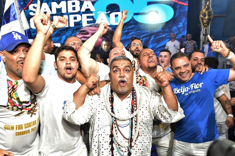 Finais de samba enredo para o carnaval 2025. Na foto,Beija-Flor,com direito a sósia do Laíla,homenageado do próximo carnaval,em meio aos compositores — Foto: Divulgação / Eduardo Hollanda