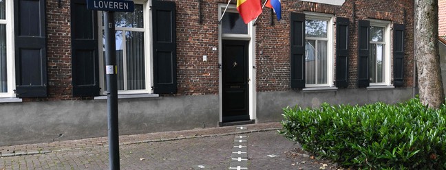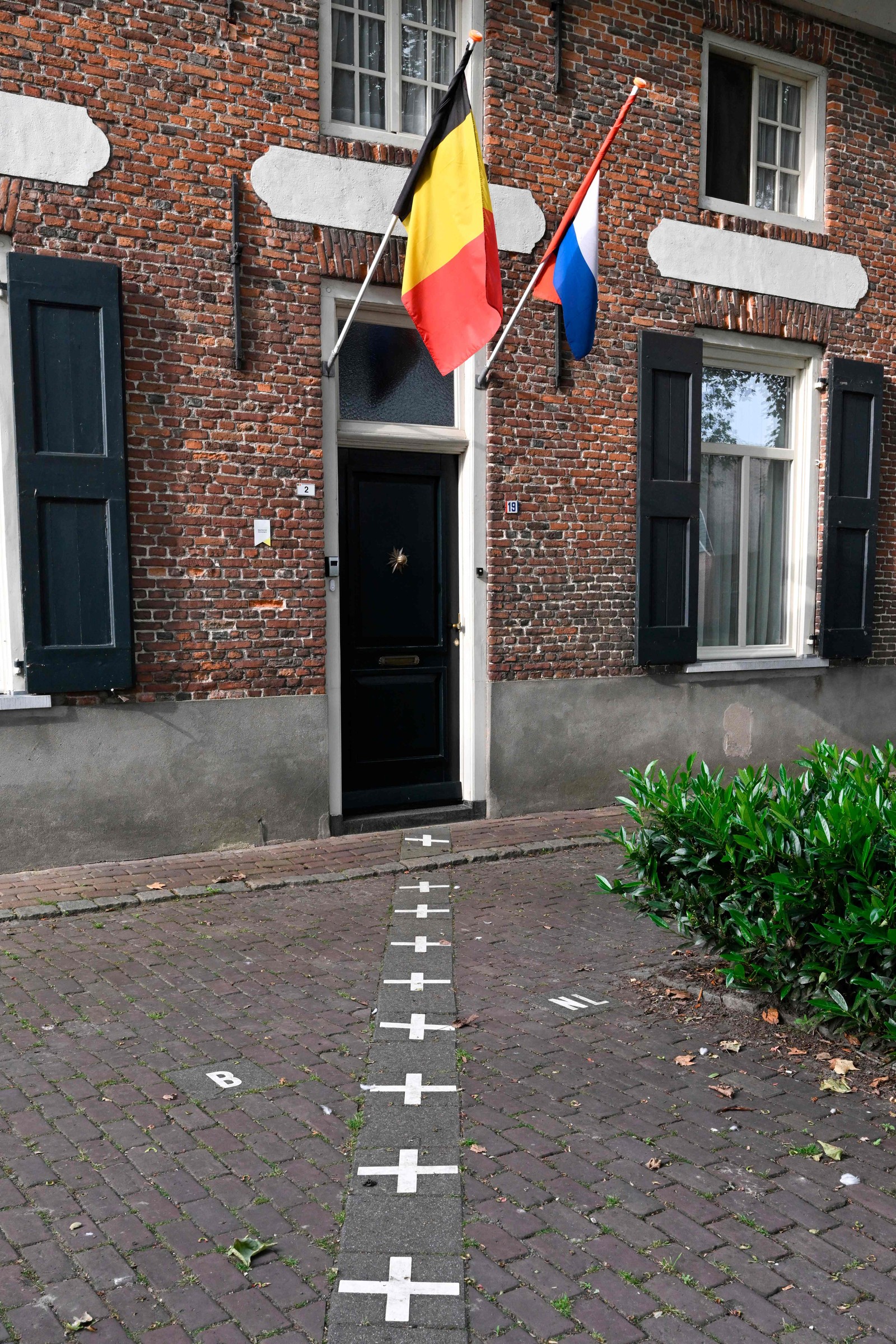 As bandeiras da Bélgica e dos Países Baixos ficam na entrada de um prédio localizado ao longo da fronteira — Foto: AFP
