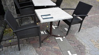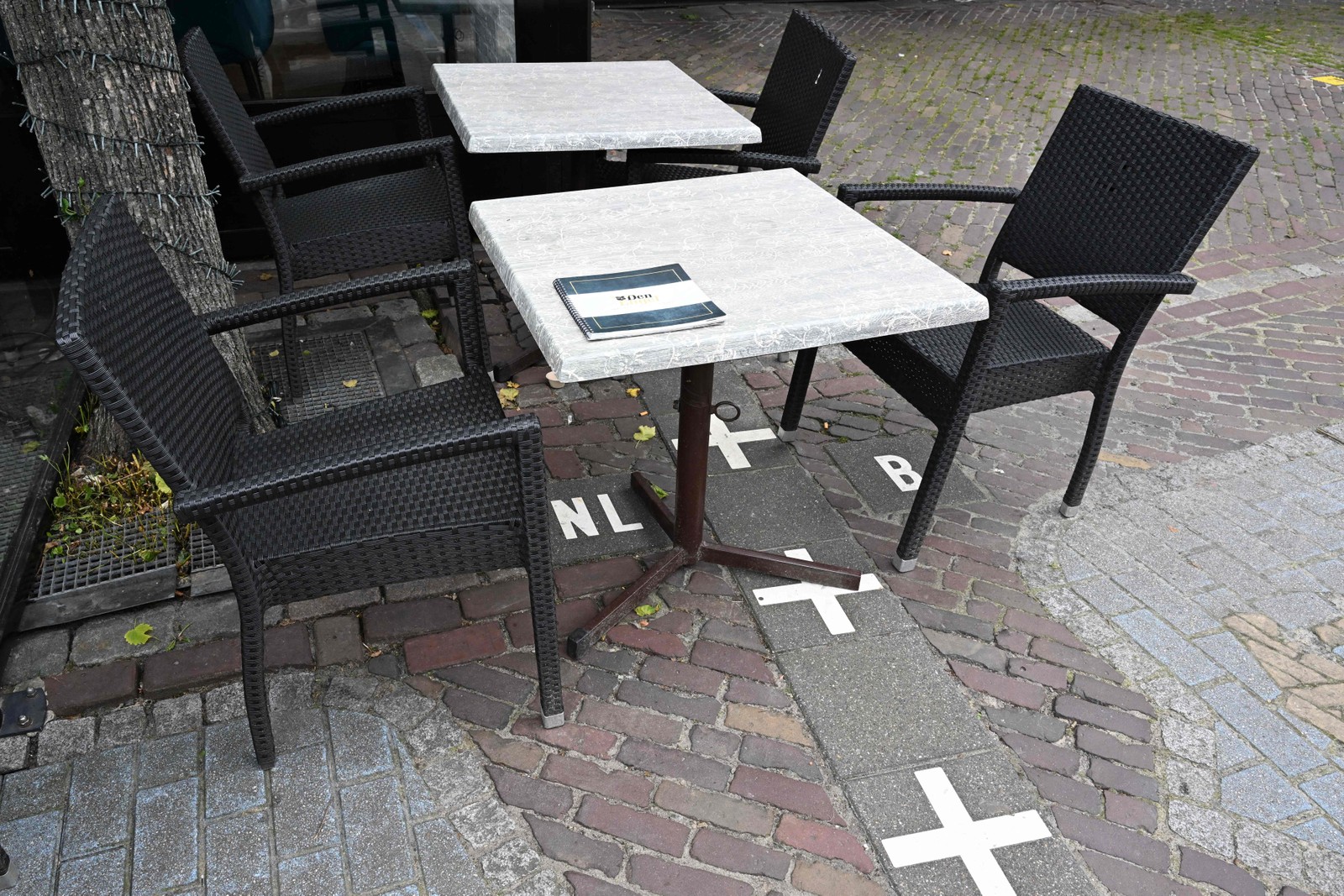 Chão de restaurante também possui marcas de divisão de fronteira — Foto: AFP