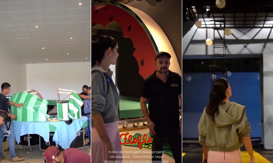 “Acompanhando a montagem da festa mais esperada dos últimos tempos,o ‘Floflo Faz 2’. Isso aqui está ficando um sonho. Um sonho. Quanta cenografia linda,quantos detalhes. A gente vai vendo as coisas nascerem aqui,as coisas acontecendo. Está virando uma cidade. Posso falar isso e vocês vão entender na terça-feira quando esse projeto estiver pronto”,afirma Tana.
