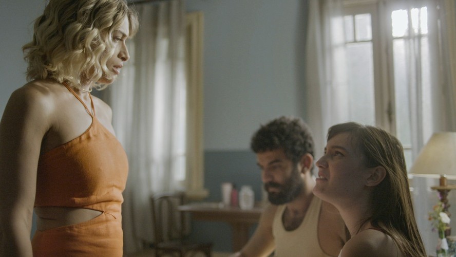 Luisa Arraes,Igor Fortunato e Nina Tomsic durante a gravação da cena de “No rancho fundo” em que Blandina flagra Zé Beltino e Dracena na cama. A vilã fica irada e agride a amiga. Vai ao ar no sábado.
