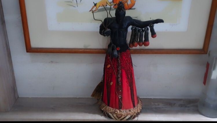 Imagem de Exu na casa de Milton Cunha. Toda segunda-feira,ele joga bebida na imagem para pedir proteção — Foto: Reprodução