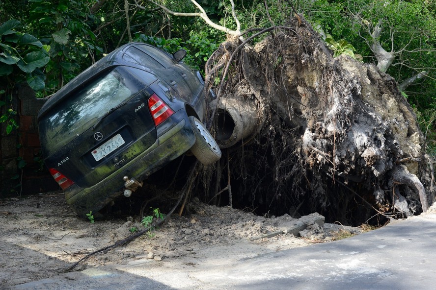Carro fica pendurado em árvore próximo a hotel,em Camboinhas,Niterói,após temporal em fevereiro deste ano — Foto: Rafeal Timileyi Lopes