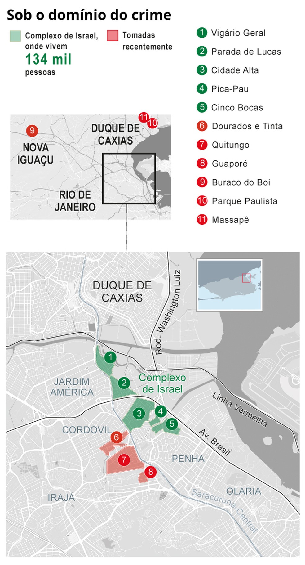O trecho da Avenida Brasil que se transformou ontem em praça de guerra fica na região sob o domínio do traficante Álvaro Malaquias Santa Rosa,um dos chefes da facção Terceiro Comando Puro (TCP). Apesar de ter 35 anotações em sua Ficha de Antecedentes Criminais e sete mandados de prisão em aberto,o bandido jamais foi capturado pela polícia. Com perfil extremamente violento,ele deu o nome de Complexo de Israel às cinco primeiras comunidades que conquistou: Vigário Geral,Parada de Lucas,Cidade Alta,Pica-Pau e Cinco Bocas — um território vigiado por cerca de 200 fuzis.