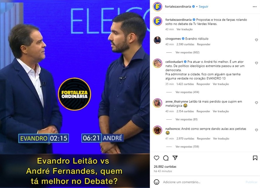 No post em que Ciro se manifestou,a página questionava seus seguidores: “Evandro Leitão vs André Fernandes,quem tá melhor no debate”.