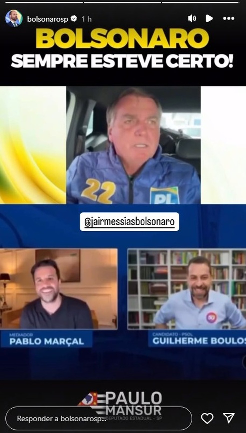 Já o deputado Eduardo Bolsonaro postou um trecho da entrevista dada pelo psolista ao empresário para resgatar um vídeo do pai com críticas ao candidato derrotado do PRTB. No trecho publicado,o ex-presidente manifesta incômodo com a tentativa do empresário se apresentar como candidato à Presidência e aponta que "se ele (Pablo Marçal) transmitisse confiança,eu daria Graças a Deus e diria — vamos em frente".