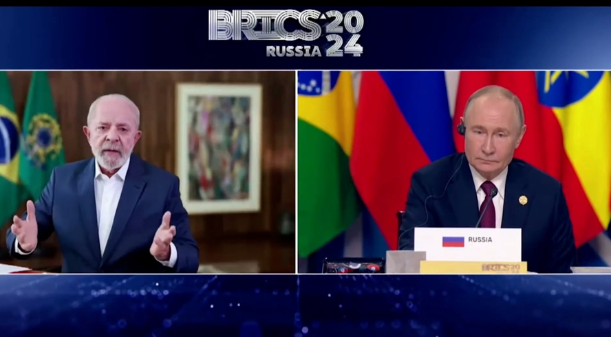 Presidente da Rússia,Vladimir Putin,assiste ao discurso do presidente Lula durante cúpula do Brics — Foto: Reprodução/Transmissão Oficial/ Brics