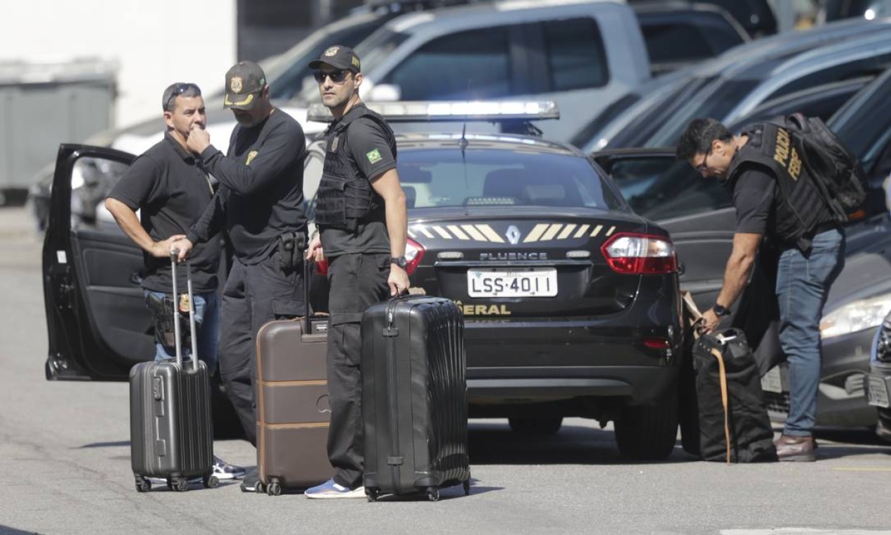Agentes da PF chegam à sede da polícia com malas de dinheiro em espécie: o montante chegaria a cerca de 20 milhões,entre reais,euros e dólares — Foto: Márcia Foletto / Agência O Globo