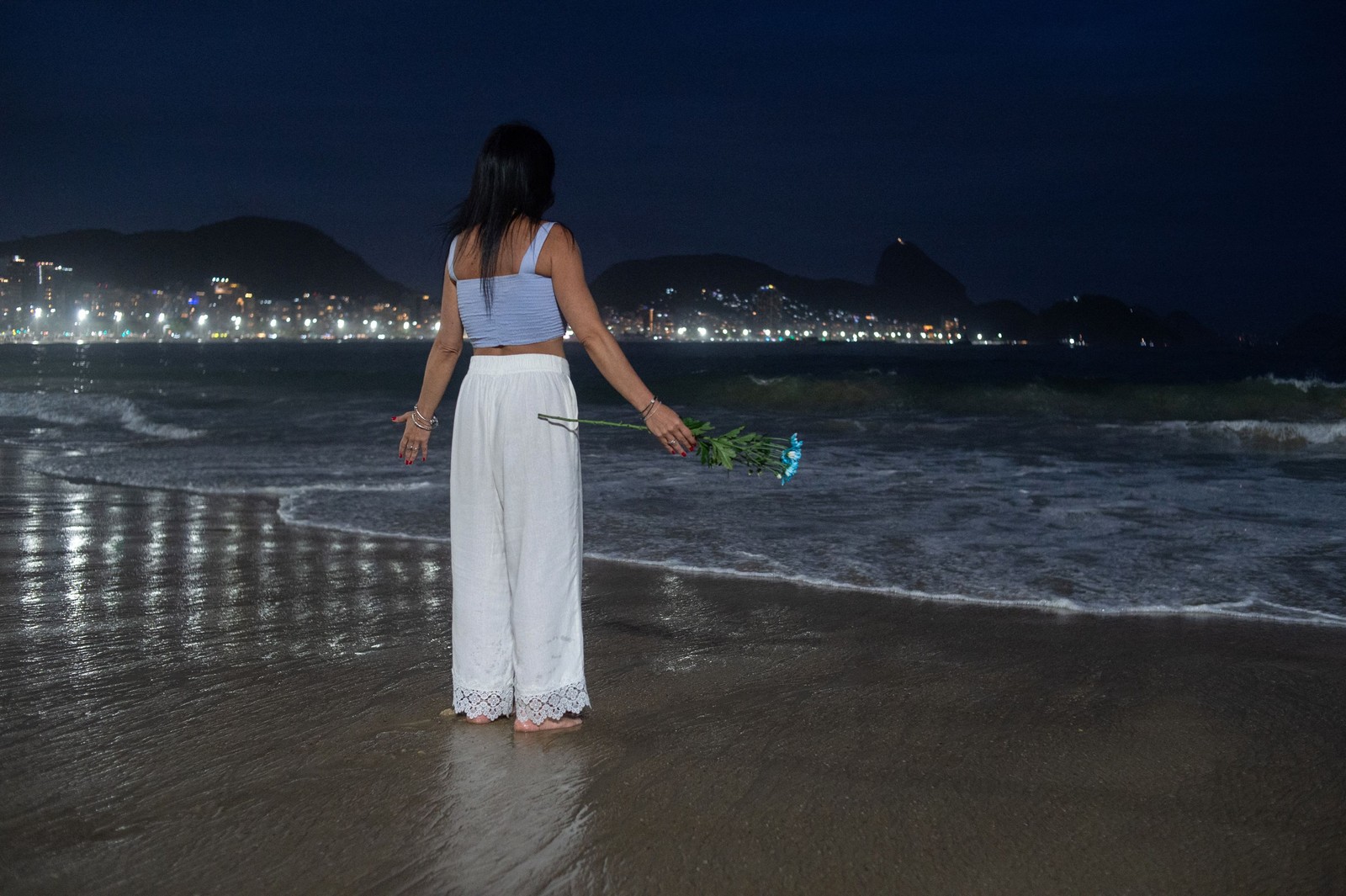 Público joga flores no mar em homenagem à Iemanjá — Foto: TERCIO TEIXEIRA / AFP