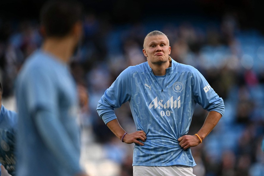 Erling Haaland durante aquecimento para Manchester City x Southampton — Foto: Oli SCARFF / AFP