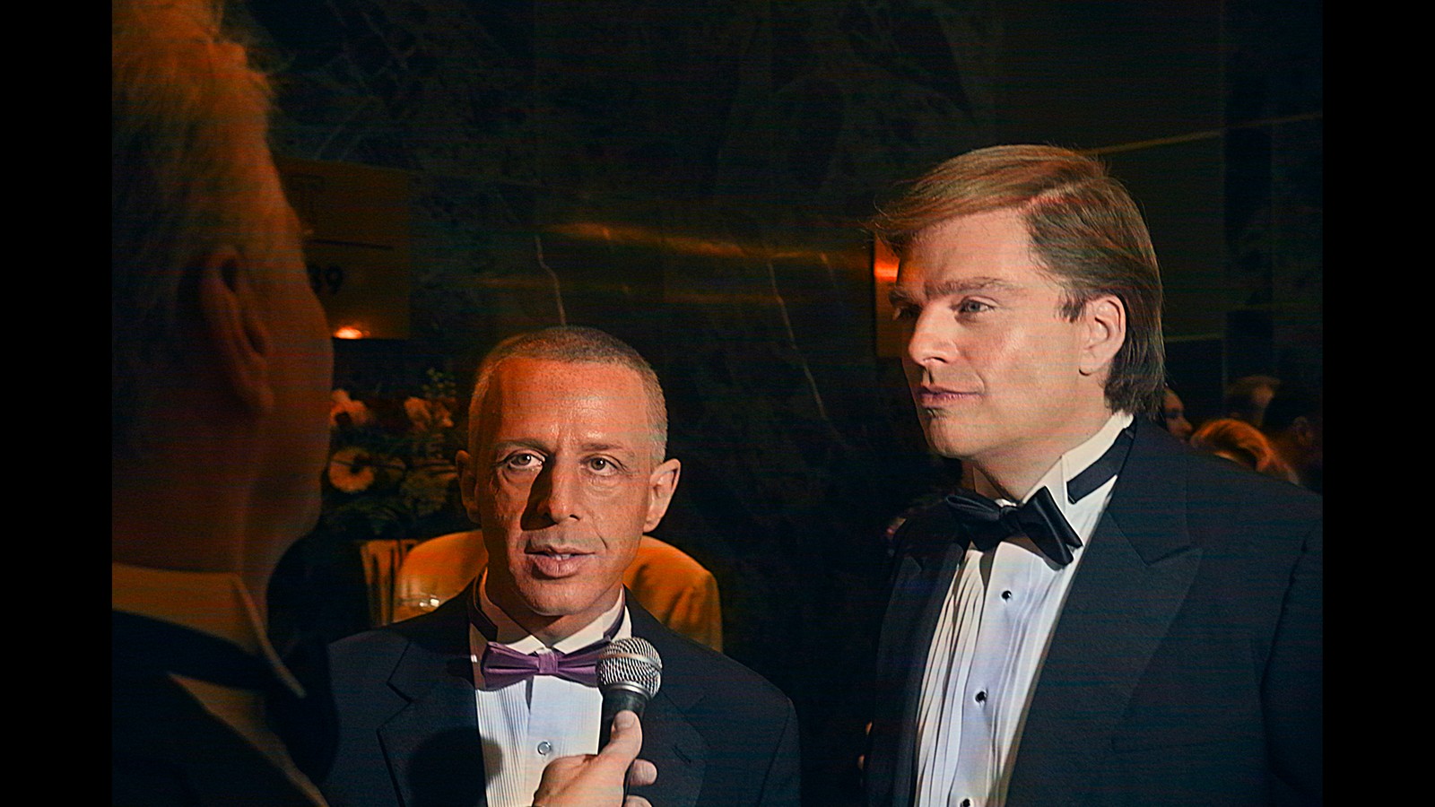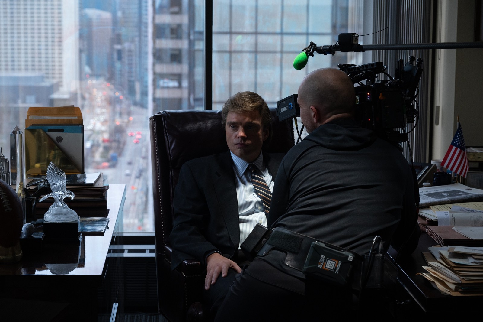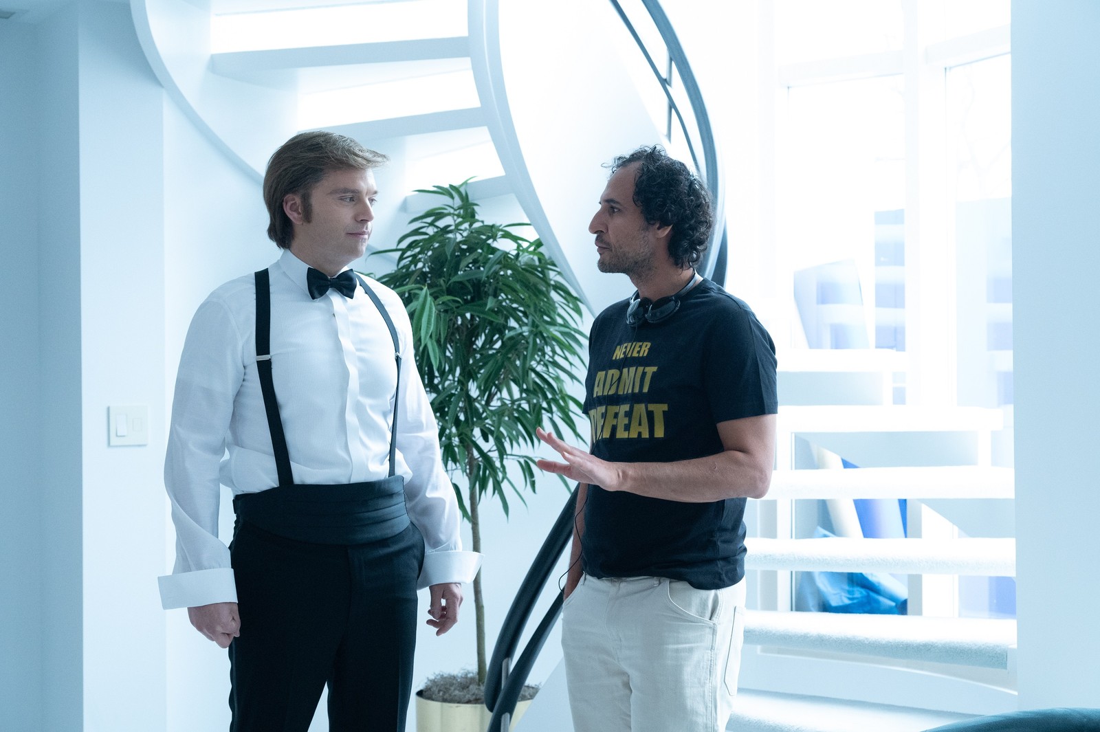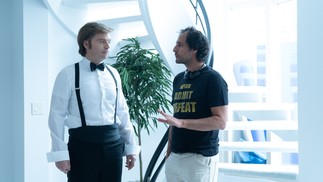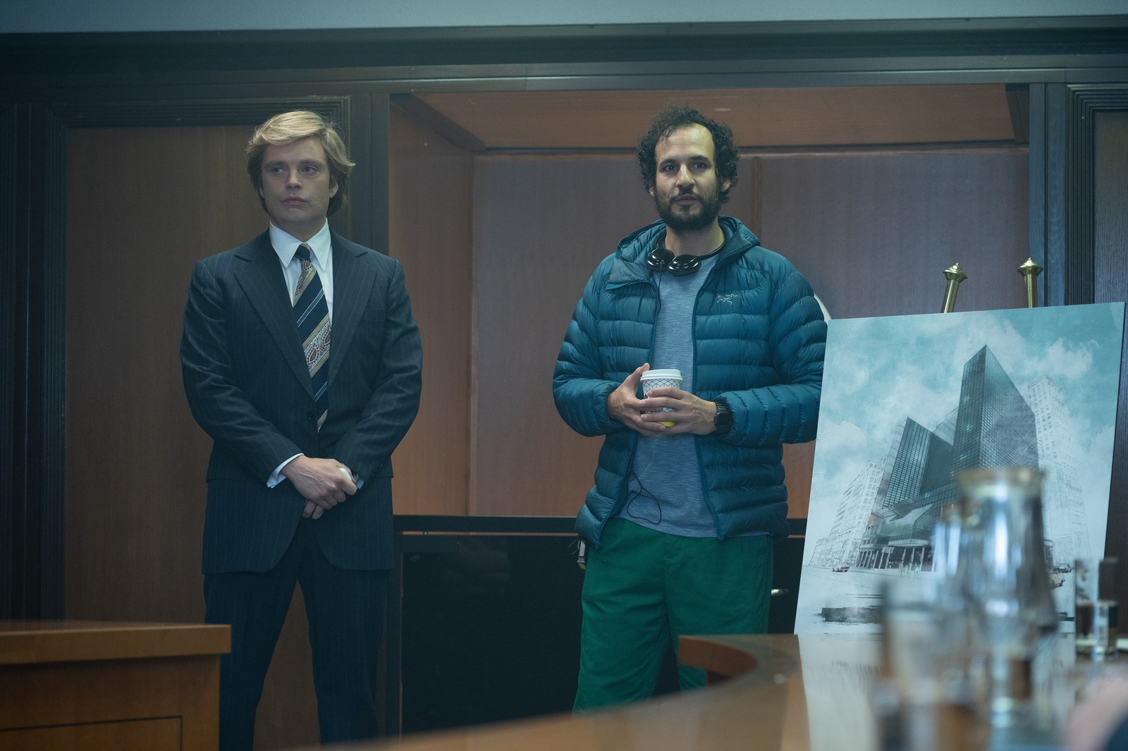 O ator Sebastian Stan (esq.) nos bastidores de 'O aprendiz' — Foto: Foto: Pief Weyman/ Divulgação