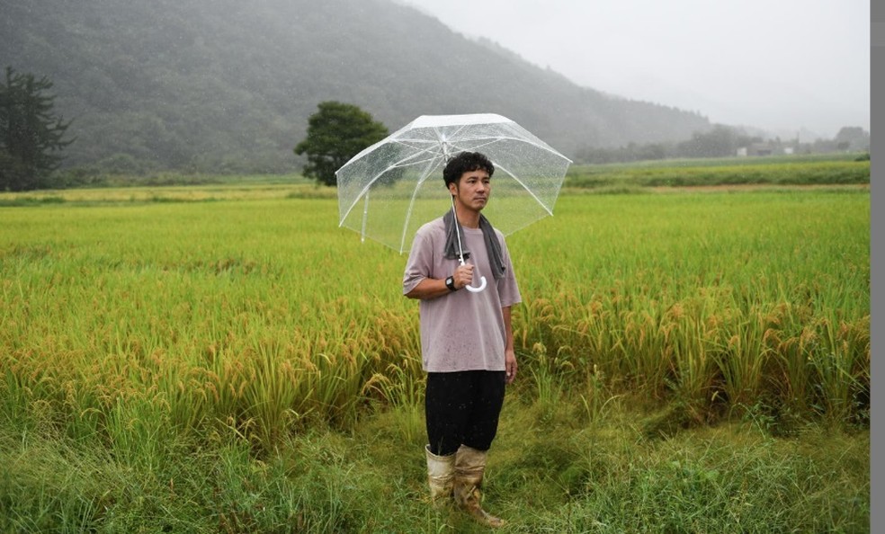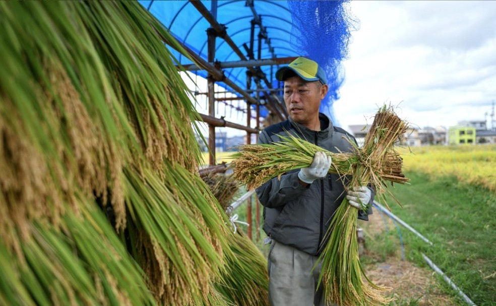 O agricultor Shingo Kuwabara em seu campo de Shinnosuke,um arroz desenvolvido pelo Instituto de Pesquisa Agrícola de Niigata,capaz de suportar temperaturas extremas — Foto: Noriko Hayashi/The New York Times