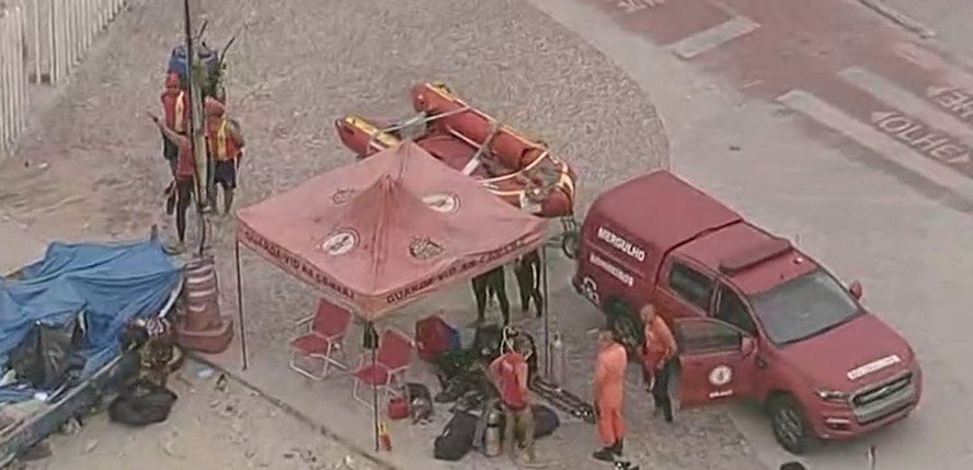 Equipes do Corpo de Bombeiros fazem buscas por pessoa desaparecida no Recreio — Foto: Reprodução / TV Globo