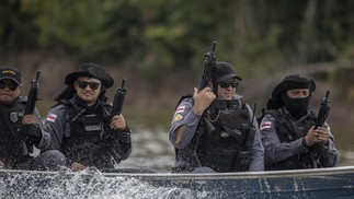 Agentes da PM do Amazonas participam da busca pelos corpos de Dom Phillips e Bruno Pereira,em Atalaia do Norte — Foto: Victor Moriyama / The New York Times