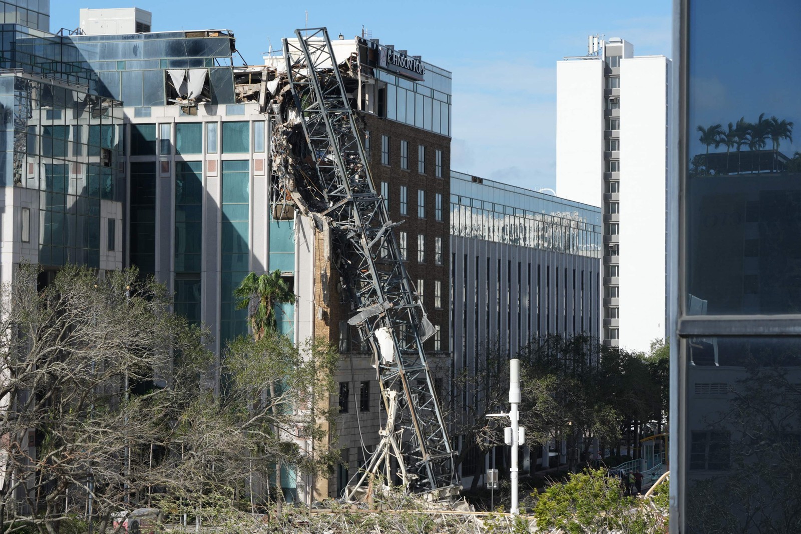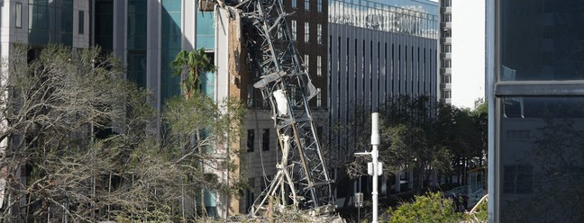 Uma grua desabou sobre um prédio no centro de São Petersburgo,na Flórida,após a passagem do Furacão Milton em 10 de outubro de 2024 — Foto: Bryan R. SMITH / AFP
