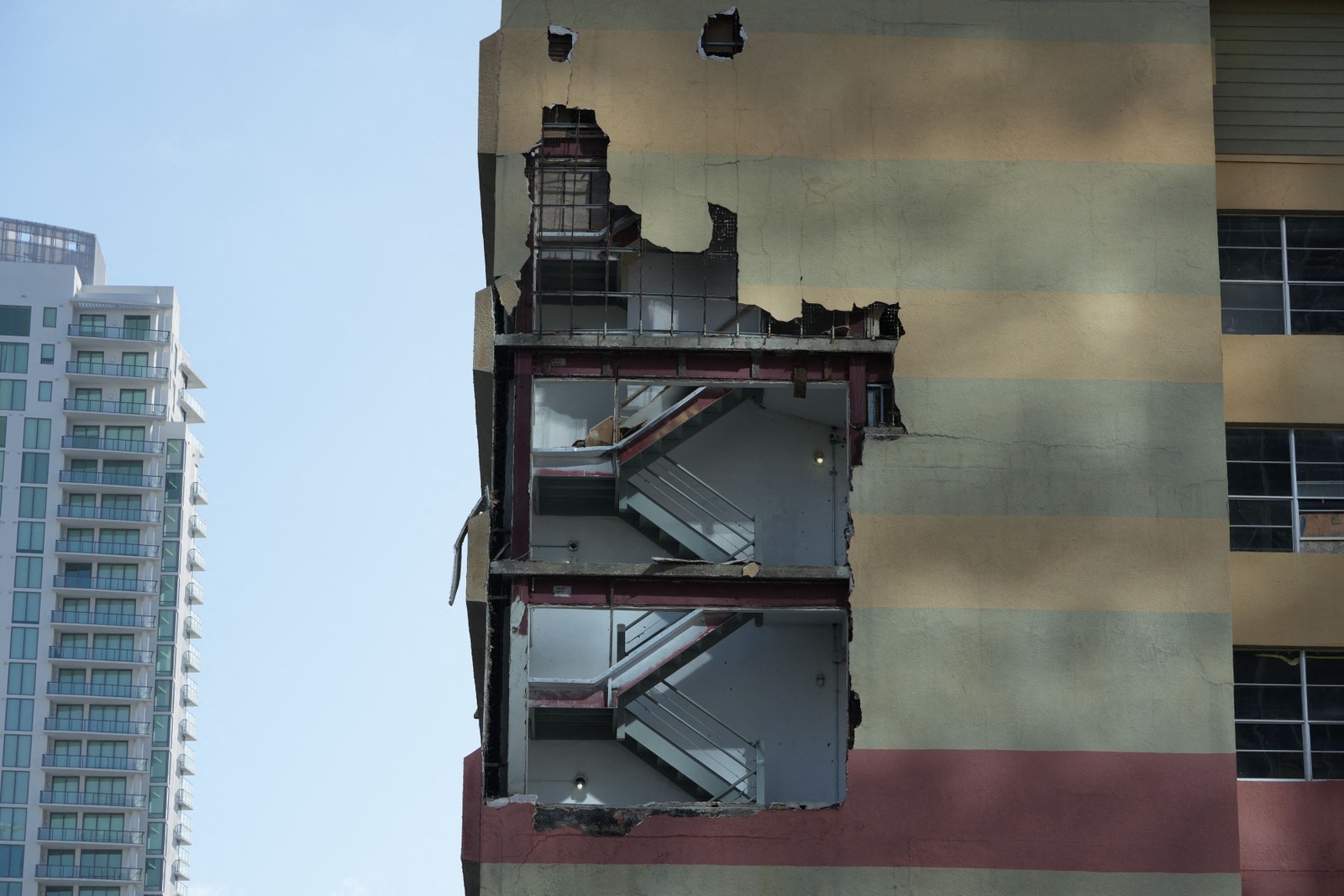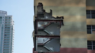 Parede de prédio destruída em São Petersburgo,devido à passagem do Furacão Milton em 10 de outubro de 2024 — Foto: Bryan R. SMITH / AFP