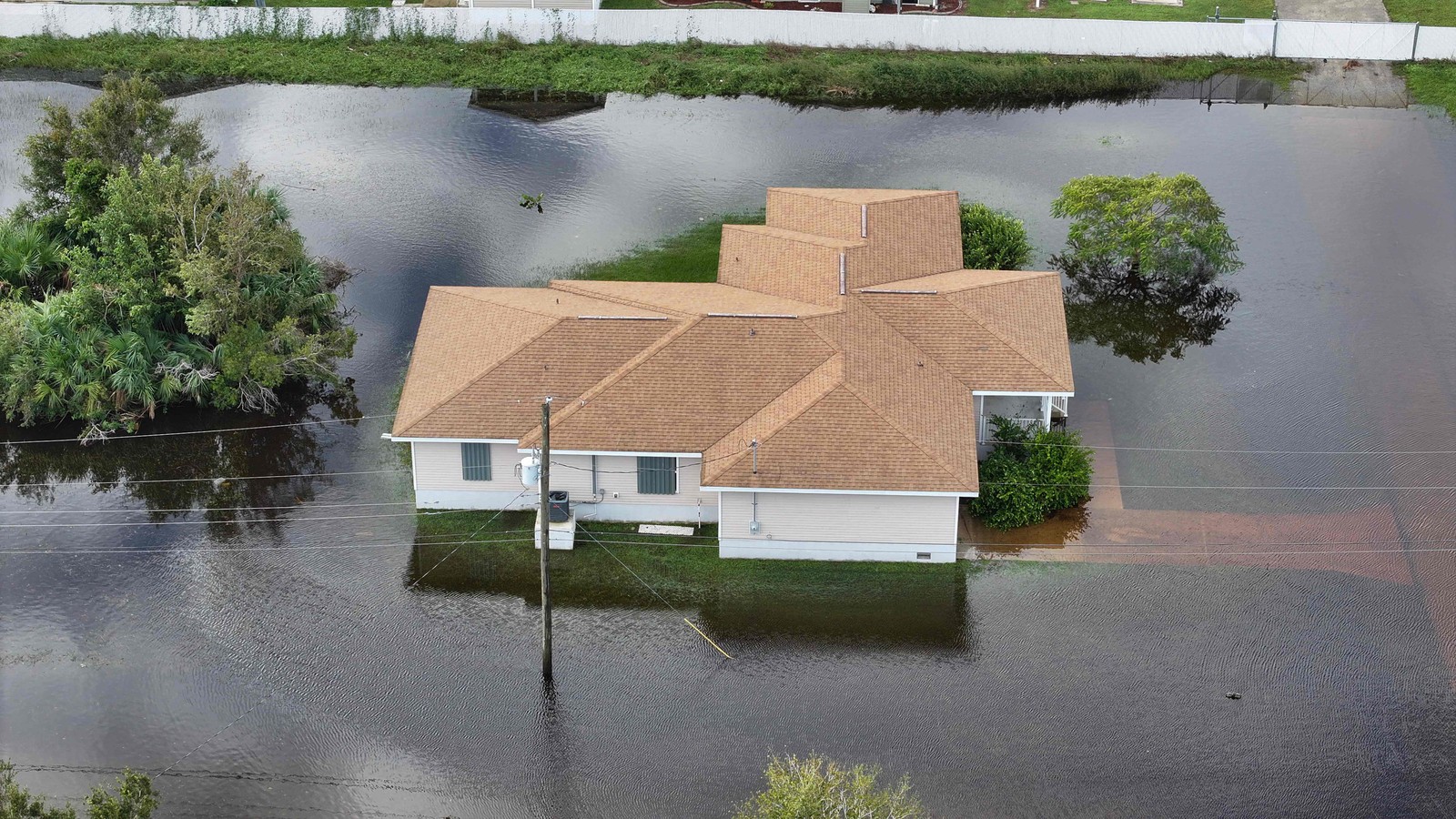 Casa em meio à enchente que inundou o bairro de Punta Gorda,após a passagem do Furacão Milton — Foto: Joe Raedle/Getty Images/AFP