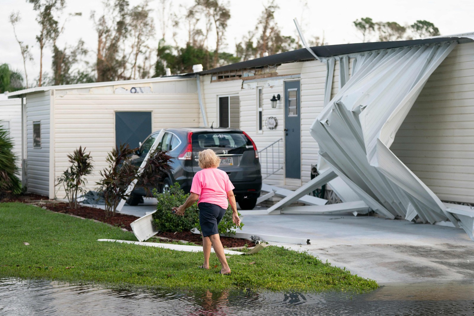 Mulher passa por casa atingida por tempestade após a passagem do Furacão Milton,em 10 de outubro de 2024,em Osprey,Flórida — Foto: Sean Rayford / Getty Images / AFP