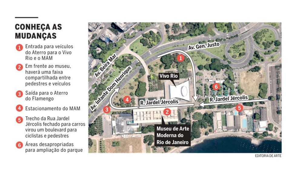O espaço ocupado por vagas clandestinas,exploradas por flanelinhas na área próxima ao Vivo Rio,foi extinto,mas o estacionamento do museu segue aberto. Com as mudanças no trânsito,a entrada e a saída de carros passam a ser pela faixa do Aterro.