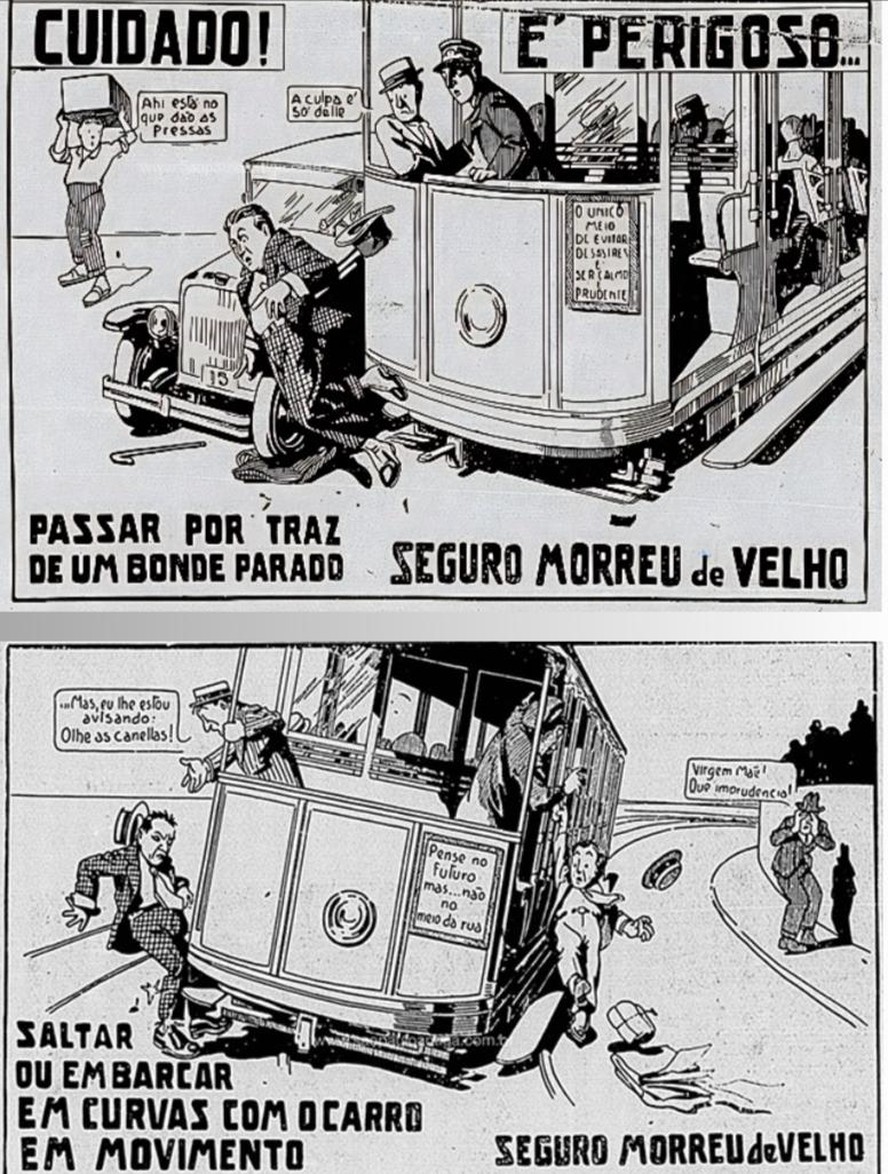 'Seguro morreu de velho' era o mote da campanha para evitar acidentes com os bondes que circulavam no Rio nos anos 1920. A imagem que alertava os usuários para não saltar do bondinho no meio da curva poderá ser vista na exposição “Bondes do Rio de Janeiro,Passado,Presente e Futuro”,que reúne mais de 150 fotografias,mapas e ilustrações no Espaço Cultural Urbana Carioca,na Praça XV,a partir do dia 12.