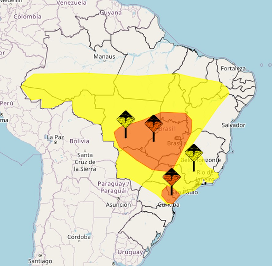 O aviso laranja encobre também Bahia,Goiás,Mato Grosso,Mato Grosso do Sul,Paraná e Tocantins. Com isso,as localidades devem ter chuva entre 30 e 60 mm/h,ventos intensos de até 100 km/h. Além disso,há risco de corte de energia elétrica,queda de galhos de árvores,alagamentos e de descargas elétricas.