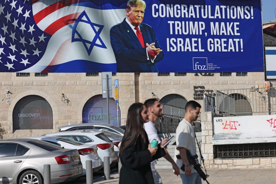 Israelenses caminham diante de cartaz celebrando a eleição de Donald Trump em Jerusalém — Foto: AHMAD GHARABLI / AFP