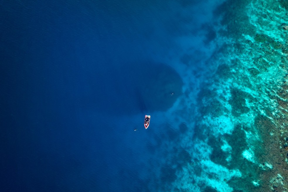 Barco de mergulho navegando sobre o maior coral do mundo localizado perto das Ilhas Salomão,no Pacífico — Foto: MANU SAN FELIX / NATIONAL GEOGRAPHIC PRISTINE SEAS / AFP