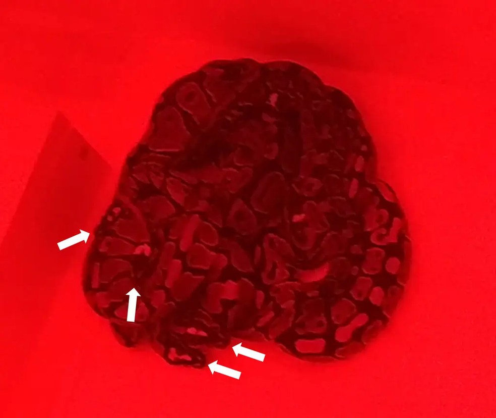 Pítons-reais reunidas,com setas brancas indicando suas cabeças — Foto: Noam Miller e Morgan Skinner/Universidade Wilfrid Laurier