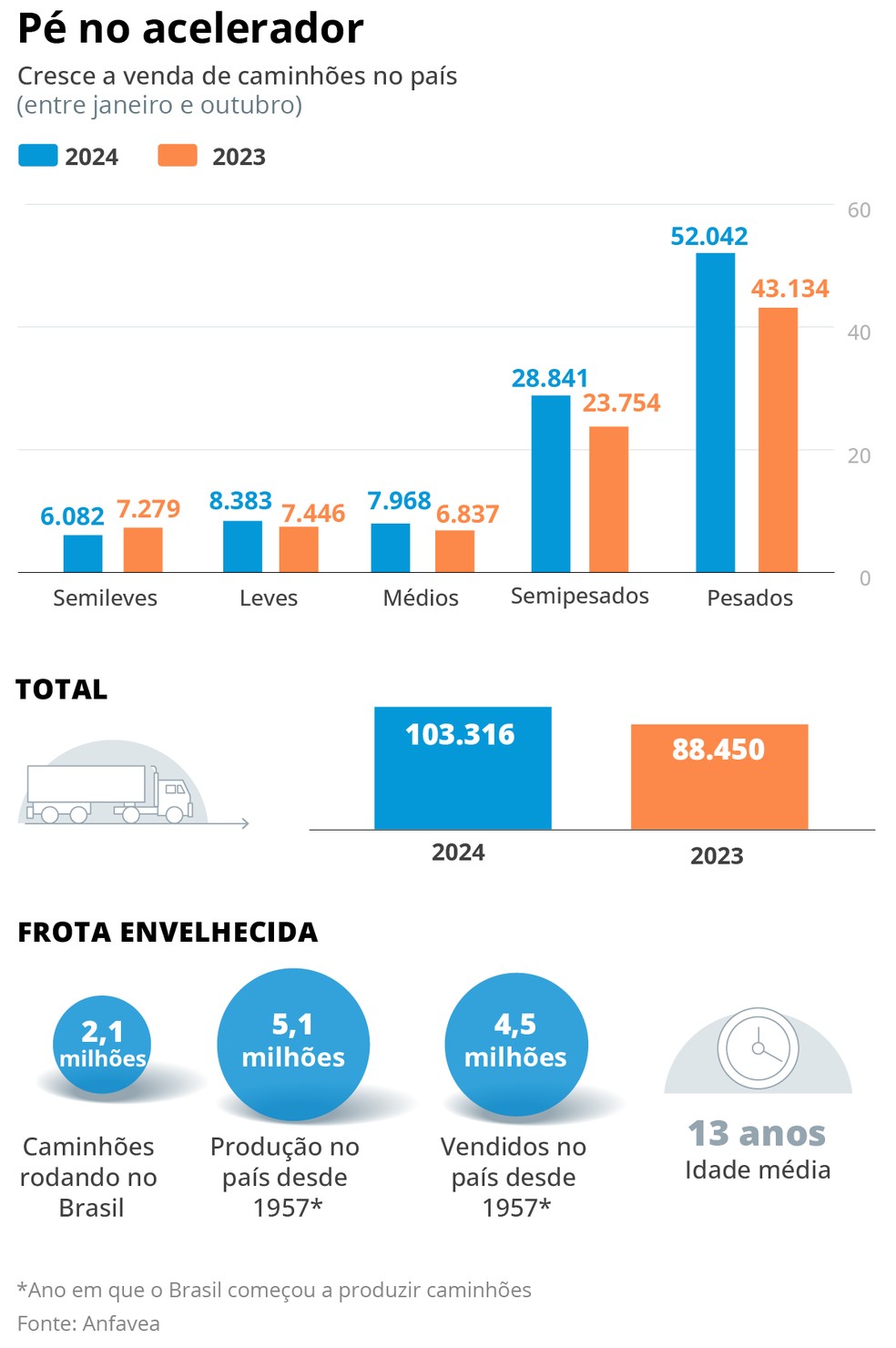 No Brasil,entre janeiro e outubro,já foram vendidos 103.316 caminhões,entre pesados,leves e veículos urbanos de carga. No ano passado,no mesmo período,foram 88.450 unidades. Considerando apenas pesados e semipesados,os emplacamentos chegaram a 80.883 ante 66.888 na comparação com 2023.