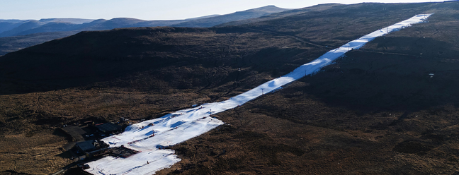 Vista aérea para a pista de esqui feita com neve artificial na estação Afriski,nas montanhas Maluti,no sul da África — Foto: Phill Magakoe / AFP
