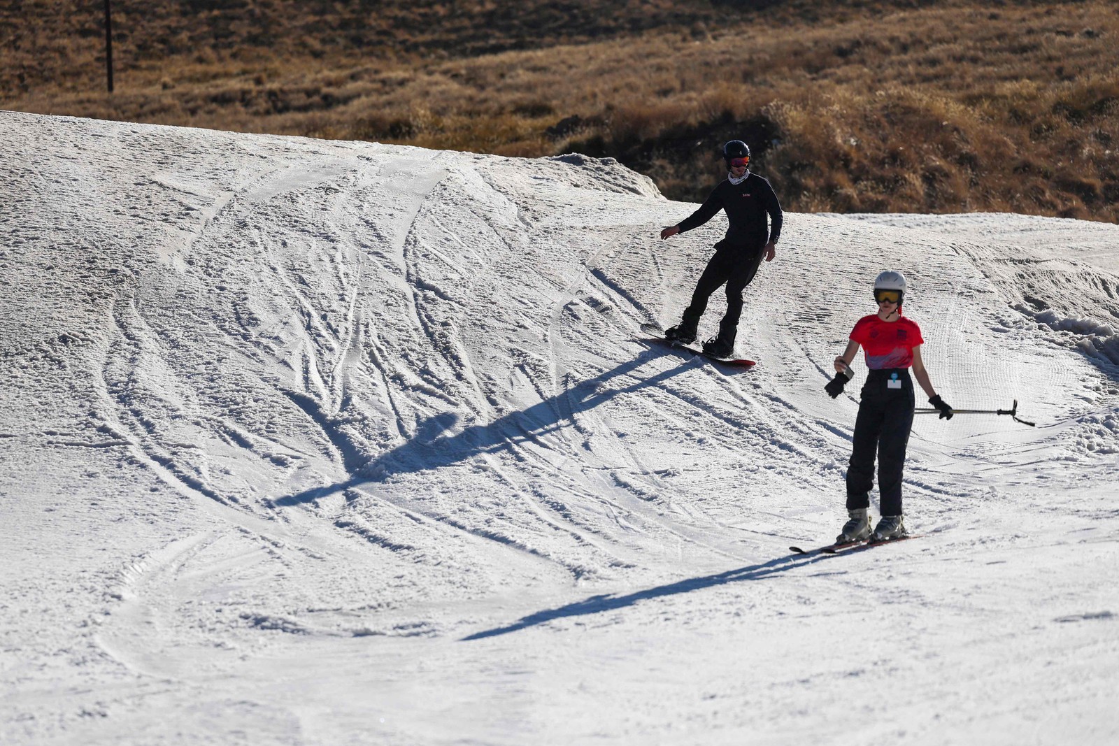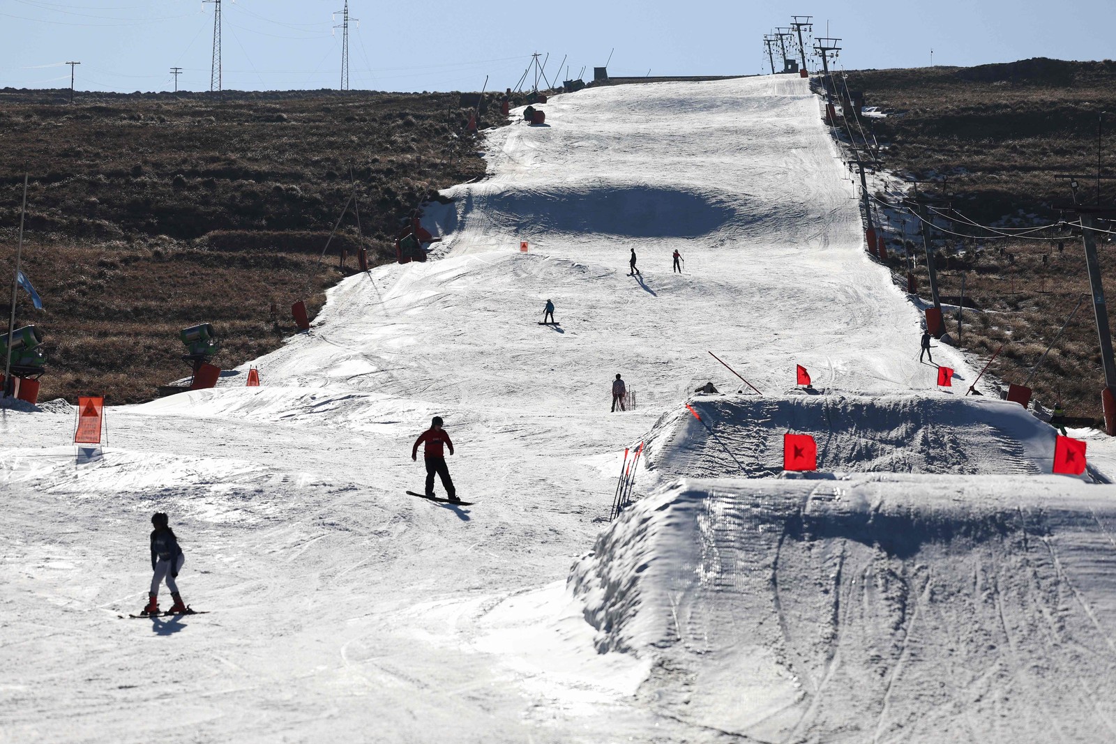 Praticantes na estação de esqui Afriski,no sul da África: resort cercado pelas montanhas Maluti precisou usar neve artificial neste inverno — Foto: Phill Magakoe / AFP