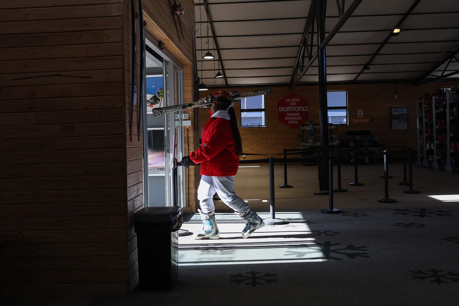 Esquiadora com seu equipamento na estação Afriski,muito frequentada por praticantes de países do continente africano — Foto: Phill Magakoe / AFP