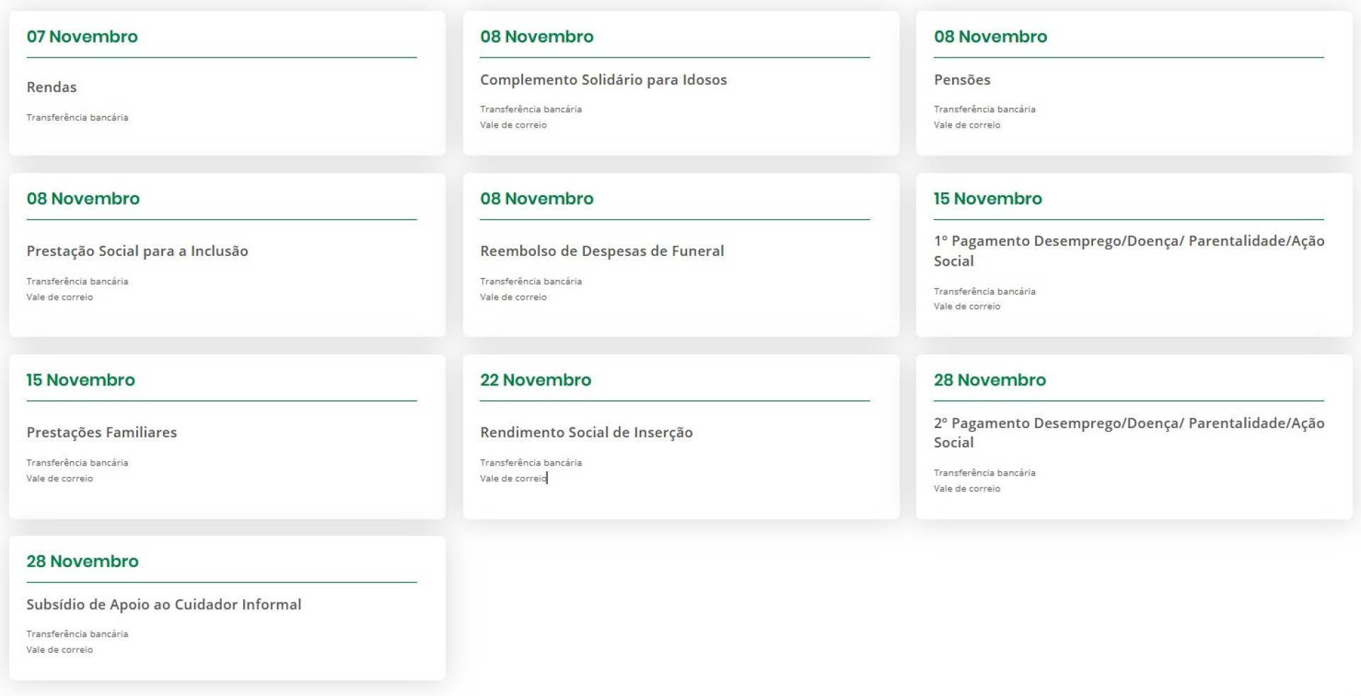 Por fim,a 28 de novembro,é a vez do segundo pagamento por desemprego/doença/parentalidade/ação social e do subsídio de apoio ao cuidador informal.