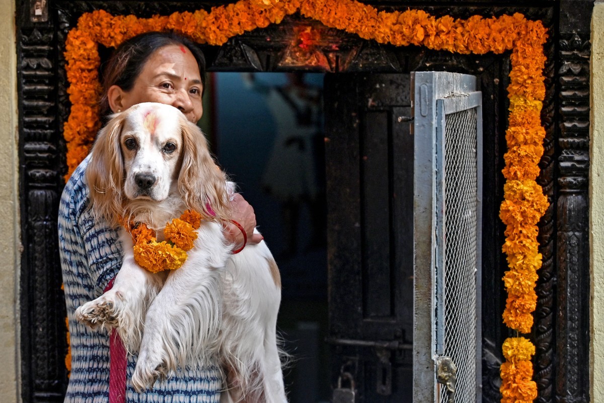 Com guirlandas de calêndula em volta do pescoço,em um dia dedicado ao amigo leal da humanidade como parte de um festival hindu — Foto: PRAKASH MATHEMA / AFP