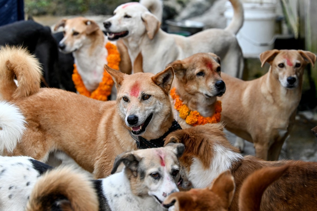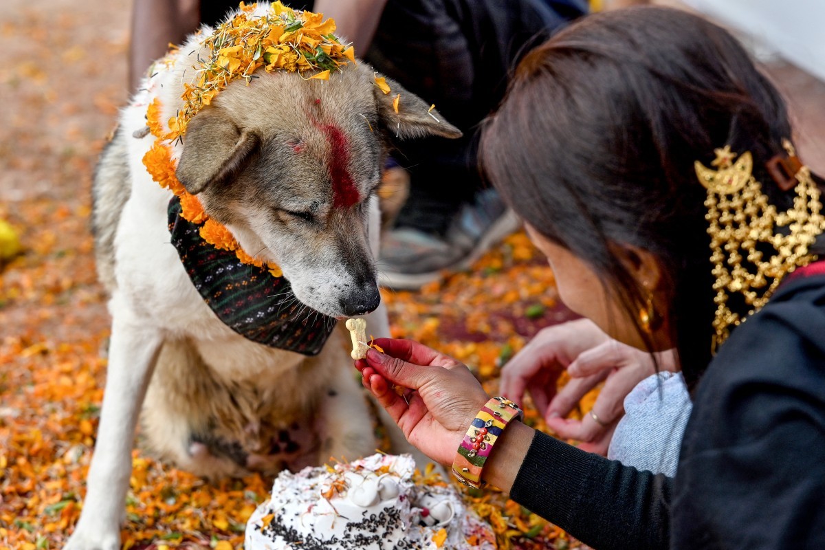 Com guirlandas de calêndula em volta do pescoço,os cães ganharam destaque no Nepal em 31 de outubro,em um dia dedicado ao amigo leal da humanidade como parte de um festival hindu — Foto: PRAKASH MATHEMA / AFP