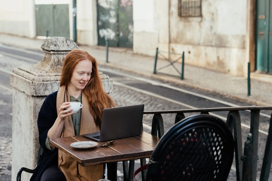 Após uma temporada eleitoral exaustiva,alguns moradores dos EUA estão considerando se mudar e trabalhar no exterior. Acima,uma trabalhadora remota em Lisboa — Foto: Alina Rudya/Bell Collective/Getty Images,via The New York Times