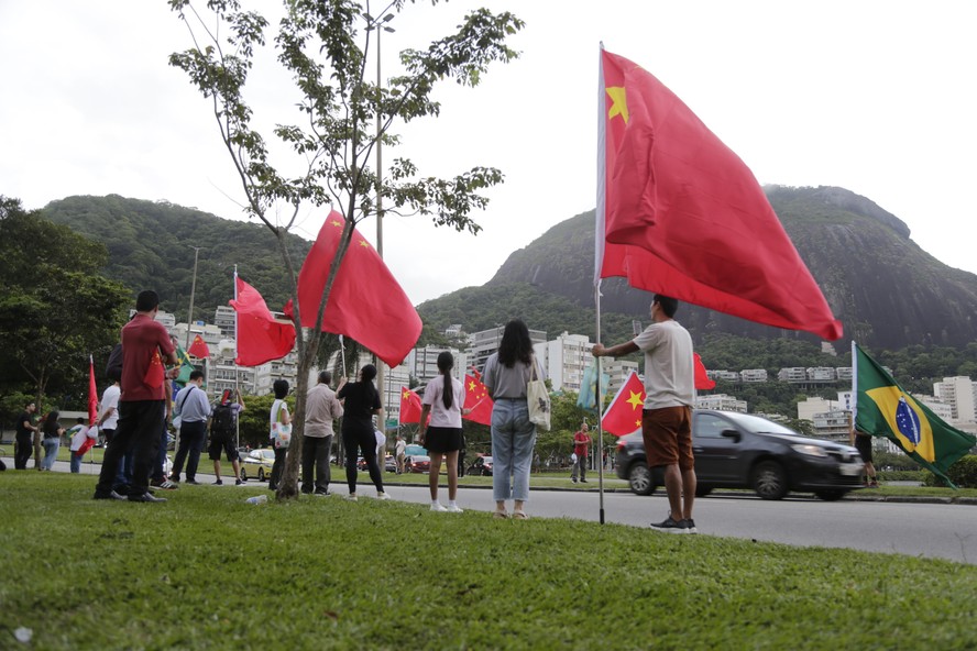 Na Lagoa Rodrigo de Freitas,grupo de 80 chineses aguarda passagem da comitiva de Xi Jinping — Foto: Alexandre Cassiano