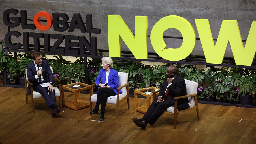 Presidentes da Comissão Europeia,Ursula von der Leyen,e da África do Sul,Cyril Ramaphosa (D),durante fórum promovido pela Global Citizen na FGV,no Rio de Janeiro — Foto: Wagner Meier/Getty Images para Global Citizen