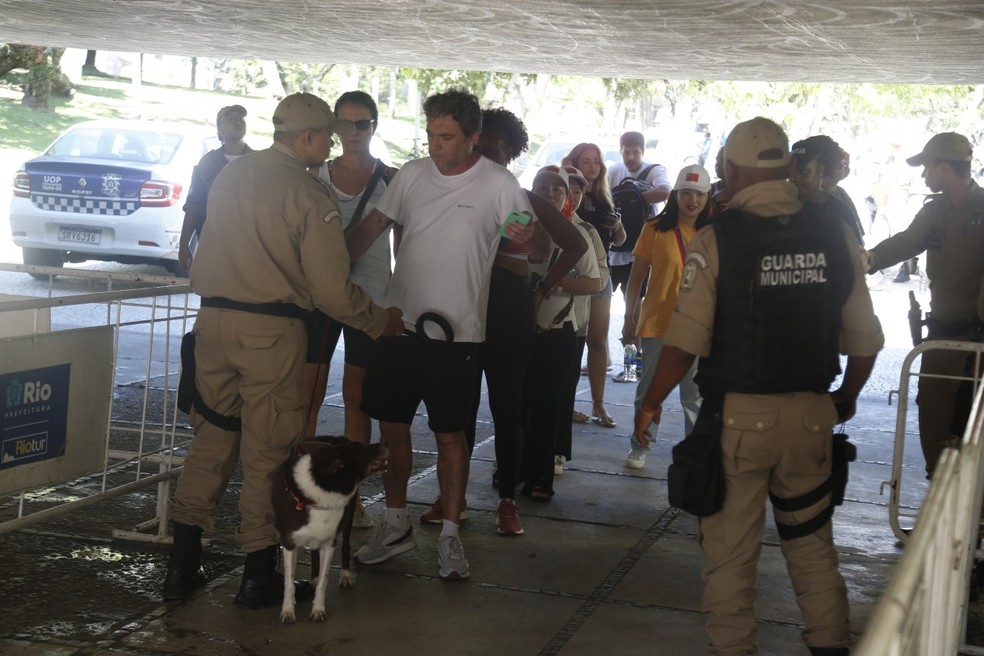 Pessoas são revistadas com detectores de metal em passagem subterrânea no Aterro do Flamengo — Foto: Fabiano Rocha / Agência O Globo