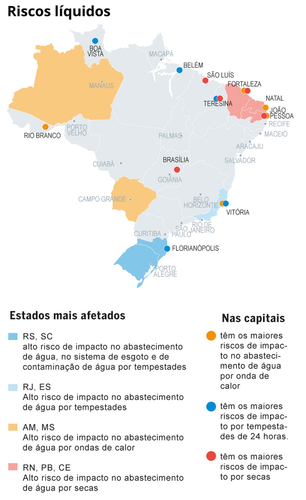 No Rio Grande do Sul,segundo a análise,92% dos municípios têm risco “muito alto” de impacto no abastecimento de água considerando os modelos de previsão de aumento de precipitações máximas em 24 horas. Já pelo parâmetro de ondas de calor afetando mananciais,o estudo ponta risco “muito alto” para 45% das cidades do Acre. No Rio,71% dos municípios têm risco “muito alto” no caso de tempestades acumuladas por cinco dias,quando sedimentos se acumulam nos rios.