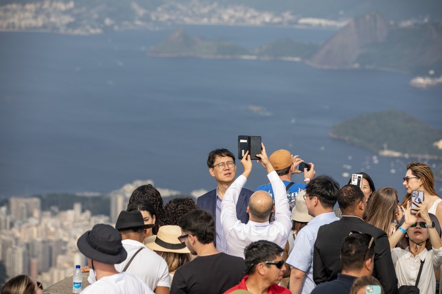 O G20 no Rio não teve uma,mas duas fotos oficiais. Em ambas,a atenção de quem vê se divide entre a presença perfilada dos chefes de Estado e de Governo das principais economias do planeta e o cenário ao fundo. A explicação é simples: na primeira,feita anteontem nos reformados jardins do Museu de Arte Moderna (MAM),o Pão de Açucar se impõe na paisagem com um céu azul de almanaque; na segunda,de ontem,é o painel com a imagem panorâmica de quase toda a Zona Sul que captura os olhares. E não parou por aí. Líderes mundiais e as respectivas delegações não economizaram nas postagens e inundaram suas redes sociais com imagens das principais atrações cariocas.