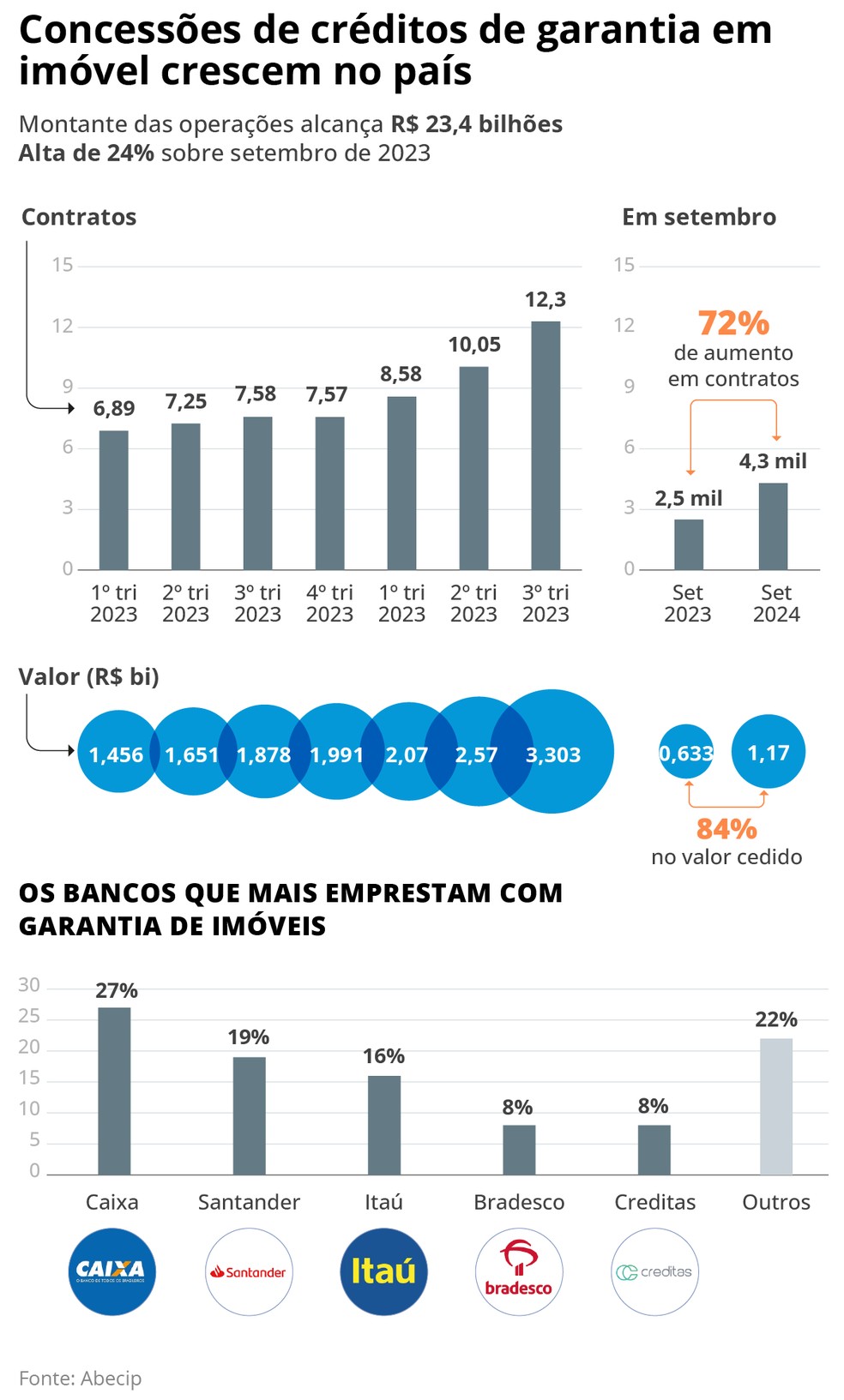 Não há dados consolidados totais sobre os empréstimos que usam esse tipo de garantia,mas a linha tem crescido. O Bradesco,por exemplo,diz ter alcançado R$ 3 bilhões em desembolsos na modalidade só este ano,um aumento de 54% na comparação com 2023. No banco,a modalidade permite crédito de até seis anos para pagar e taxas que partem de 1,19% ao mês.