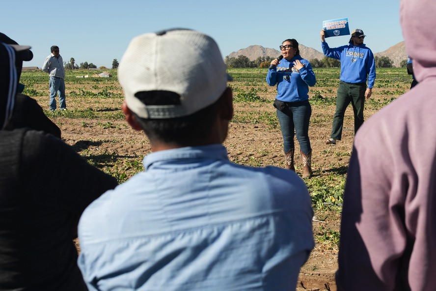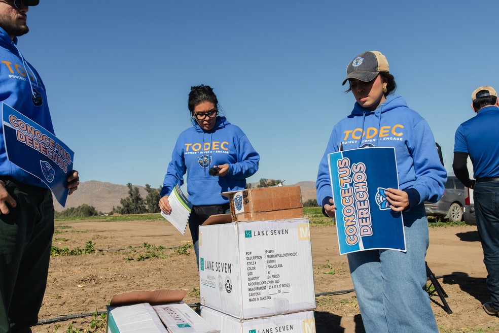 A organização tem enviado equipes para informar os trabalhadores das fazendas do corredor agrícola do sul da Califórnia,que depende da mão de obra imigrante,em grande parte sem documentos. Na manhã de quinta-feira,todos os 30 trabalhadores de uma fazenda em Lakeview fizeram uma pausa na colheita e no empacotamento de verduras para assistir a uma apresentação,a quarta realizada naquele dia.