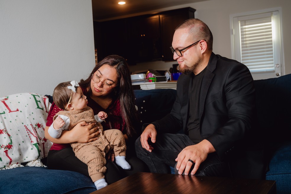 Caterina Marinero,de sete meses,e seus pais Wendy Machado e Vinchenzo Marinero,beneficiários da Ação Adiada para Chegadas na Infância (DACA) — Foto: Desiree Rios/The New York Times