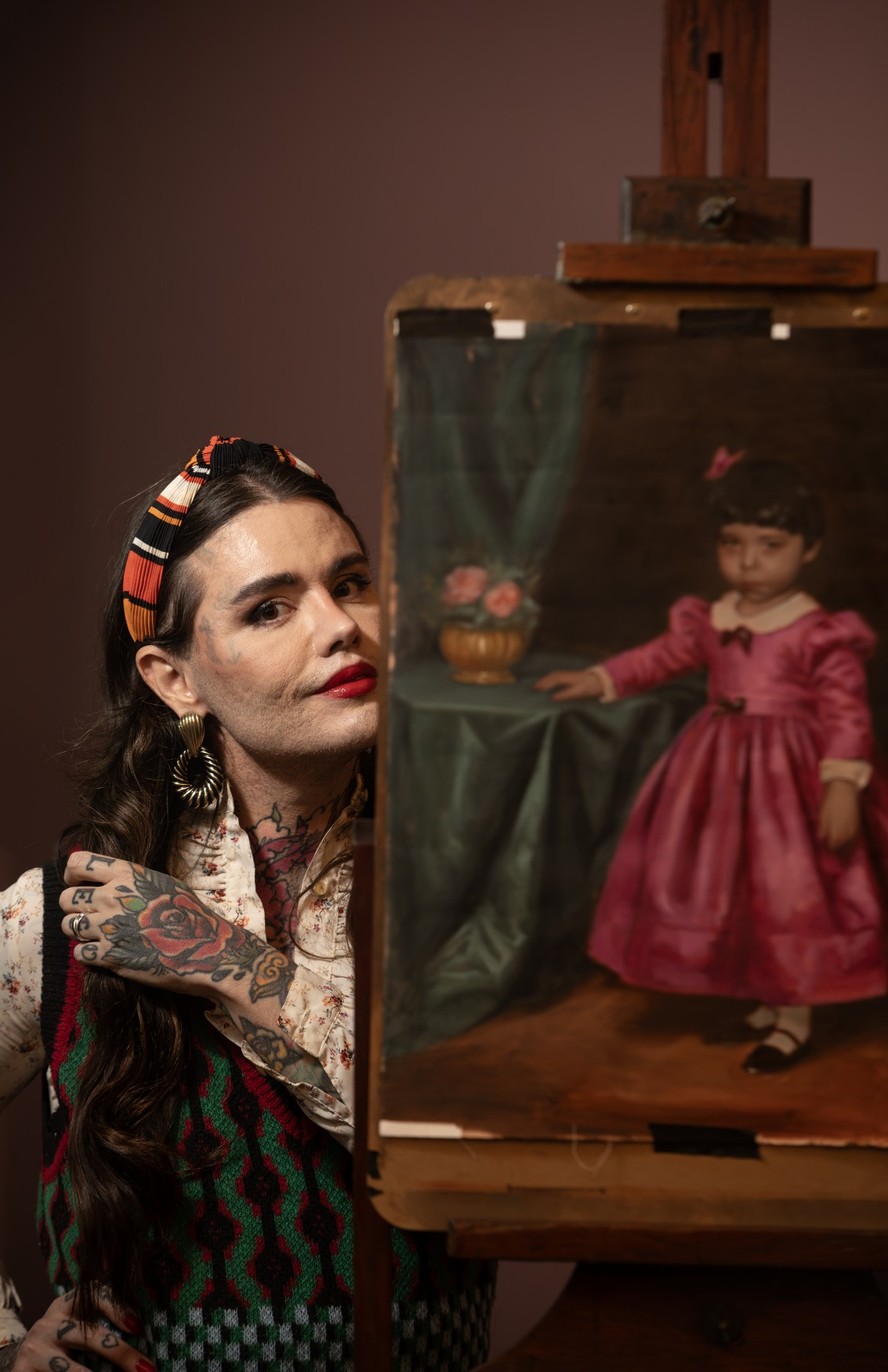 E como ela não anda só,a individual reúne outros corpos queer pintados à maneira dos grandes mestres do período clássico,em cerca de 30 telas. Na montagem,aparecem dispostas lado a lado,como nos salões de uma pinacoteca dos séculos XVIII e XIX,onde essas pessoas não estavam representadas. “Tem um sentido de resgate e reparação de uma história deixada de fora”,comenta a artista,que adquiriu molduras em leilões para sublinhar a nobreza evocada nas pinturas. “O retrato a óleo tem essa mística do tempo e da presença,já que demora para ser feito. O público entende o quanto aquela pessoa merece ser vista.”