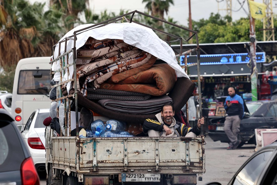 Poucas horas após o acordo entrar em vigor,famílias deslocadas começaram seu movimento de volta. Motoristas cantavam e buzinavam enquanto dirigiam,com malas,colchões e cobertores empilhados nos tetos dos veículos. Muitos circulavam de moto ou se apoiavam nas janelas dos carros,empunhando as bandeiras amarelas do Hezbollah e gritando slogans enaltecendo Hassan Nasrallah,seu líder emblemático,que foi morto em setembro em um ataque israelense.
