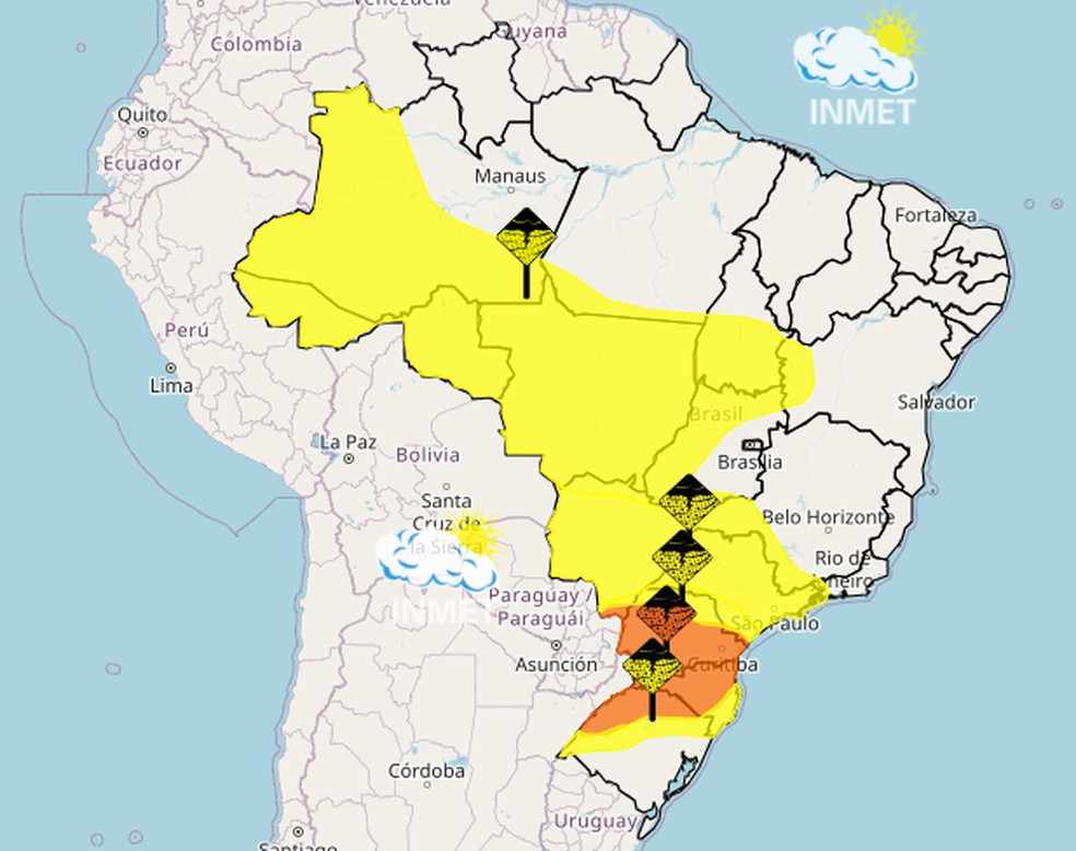 O alerta laranja,de 'Perigo' para tempestades,atinge a região oeste dos estados do Paraná,Santa Cataina,e uma pequena dos estados de São Paulo e Mato Grosso do Sul. O aviso representa chuvas entre 30 e 60 mm/h ou 50 e 100 mm/dia e ventos intensos de 60 a 100 km/h.